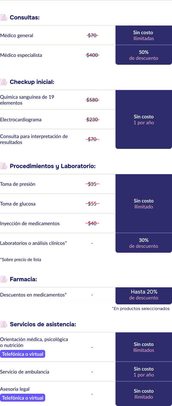 Nuestra membresía incluye consultas con médico general ilimitadas sin costo, además de exclusivos descuentos en farmacia, consultas con especialistas, productos sin costo, entre otros.